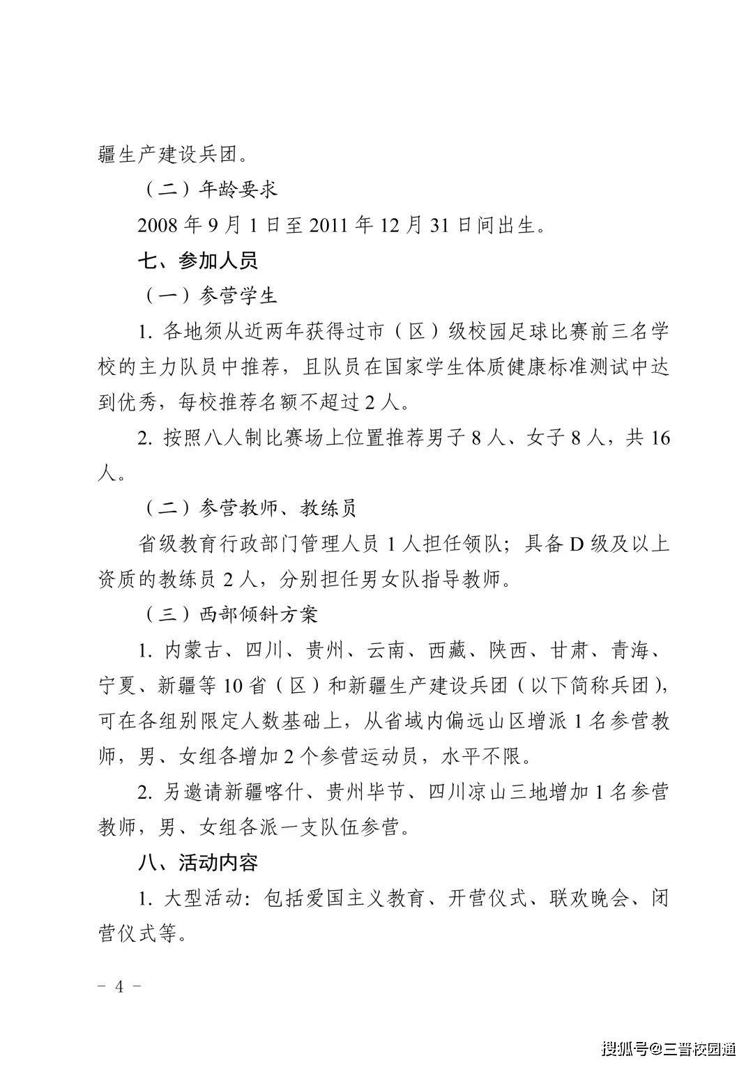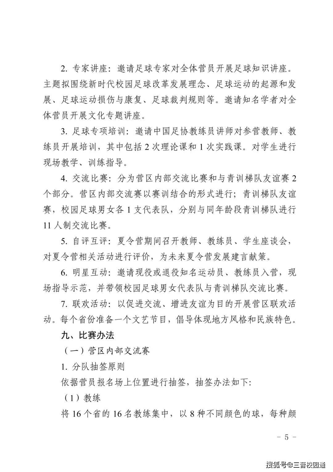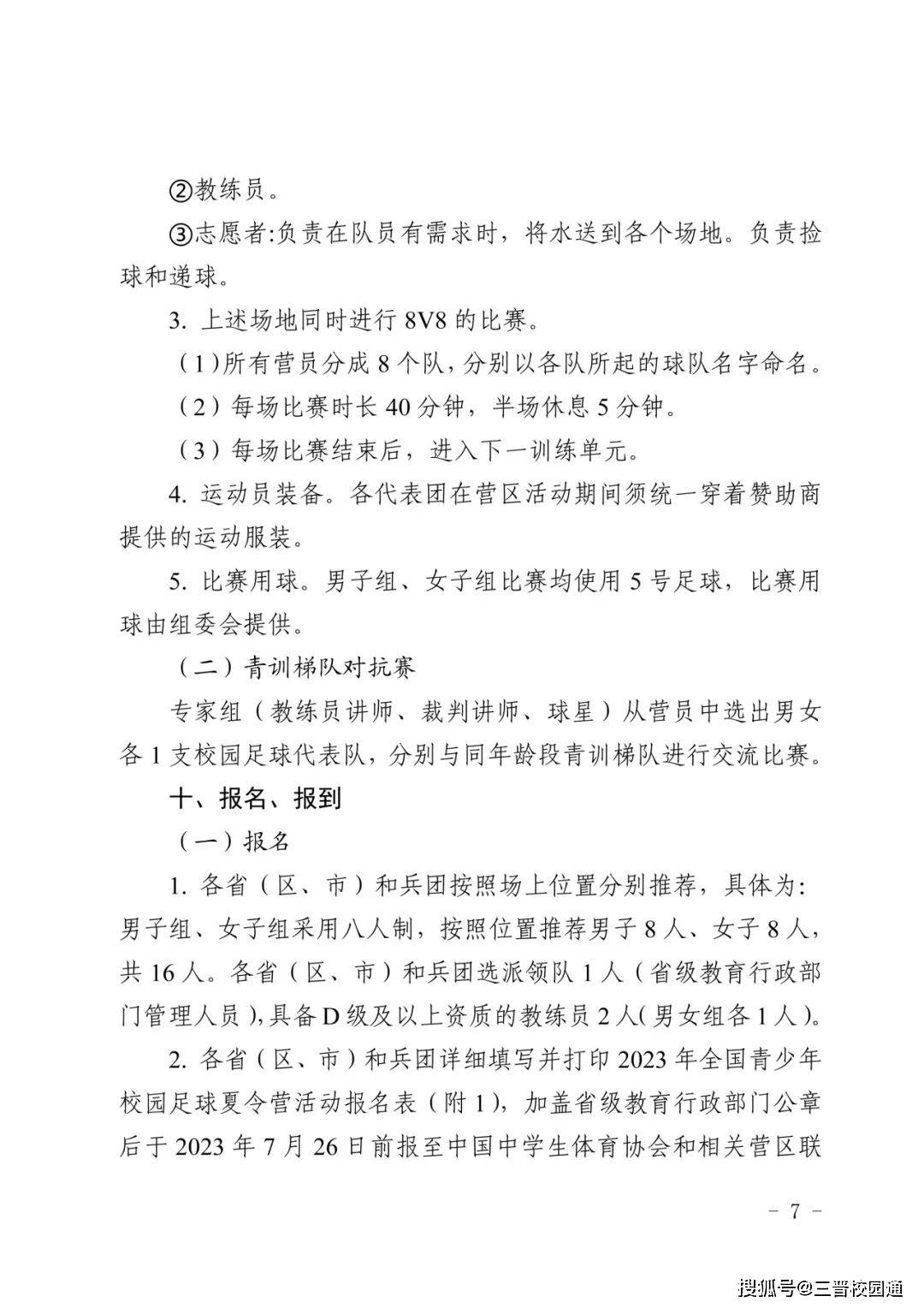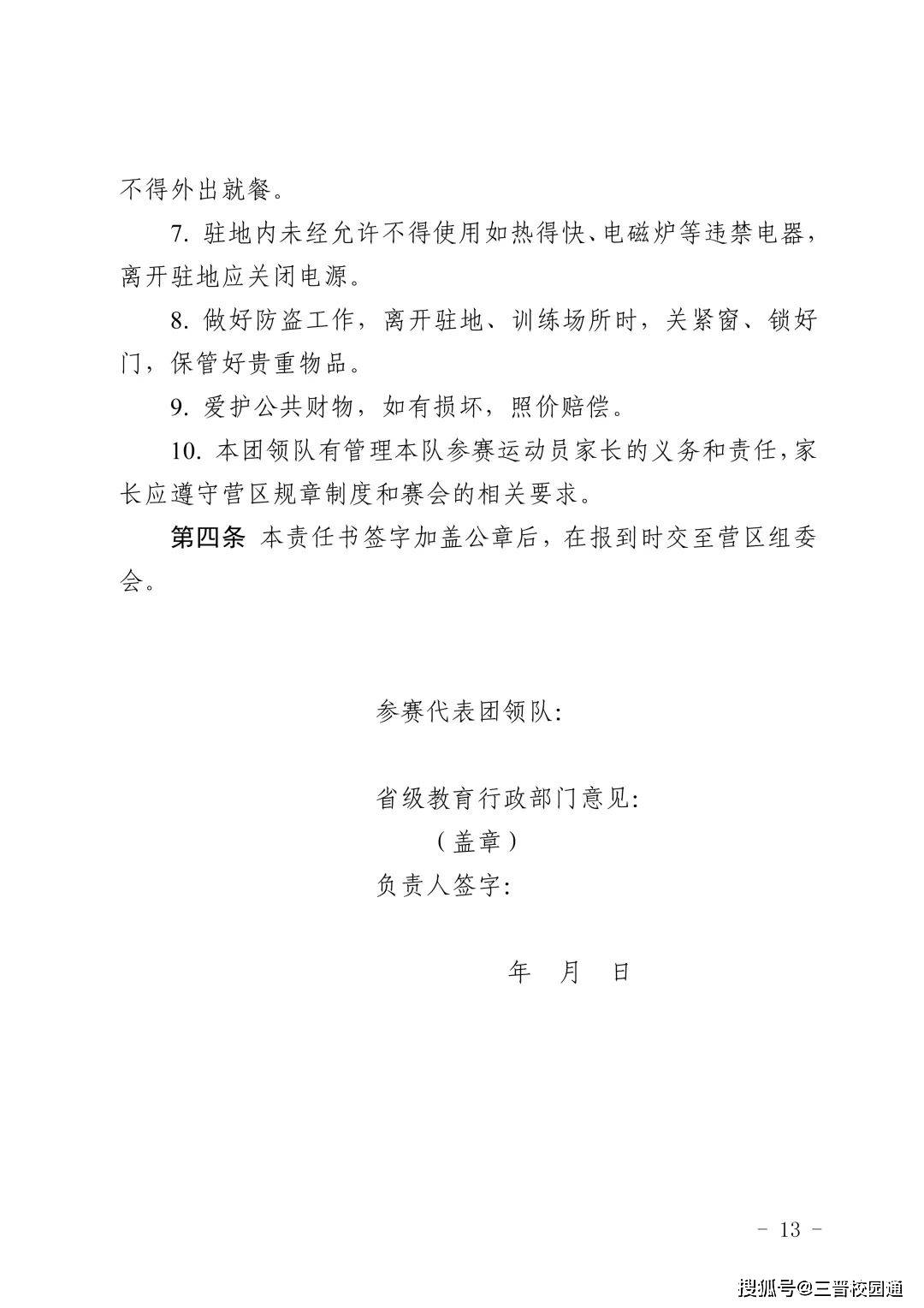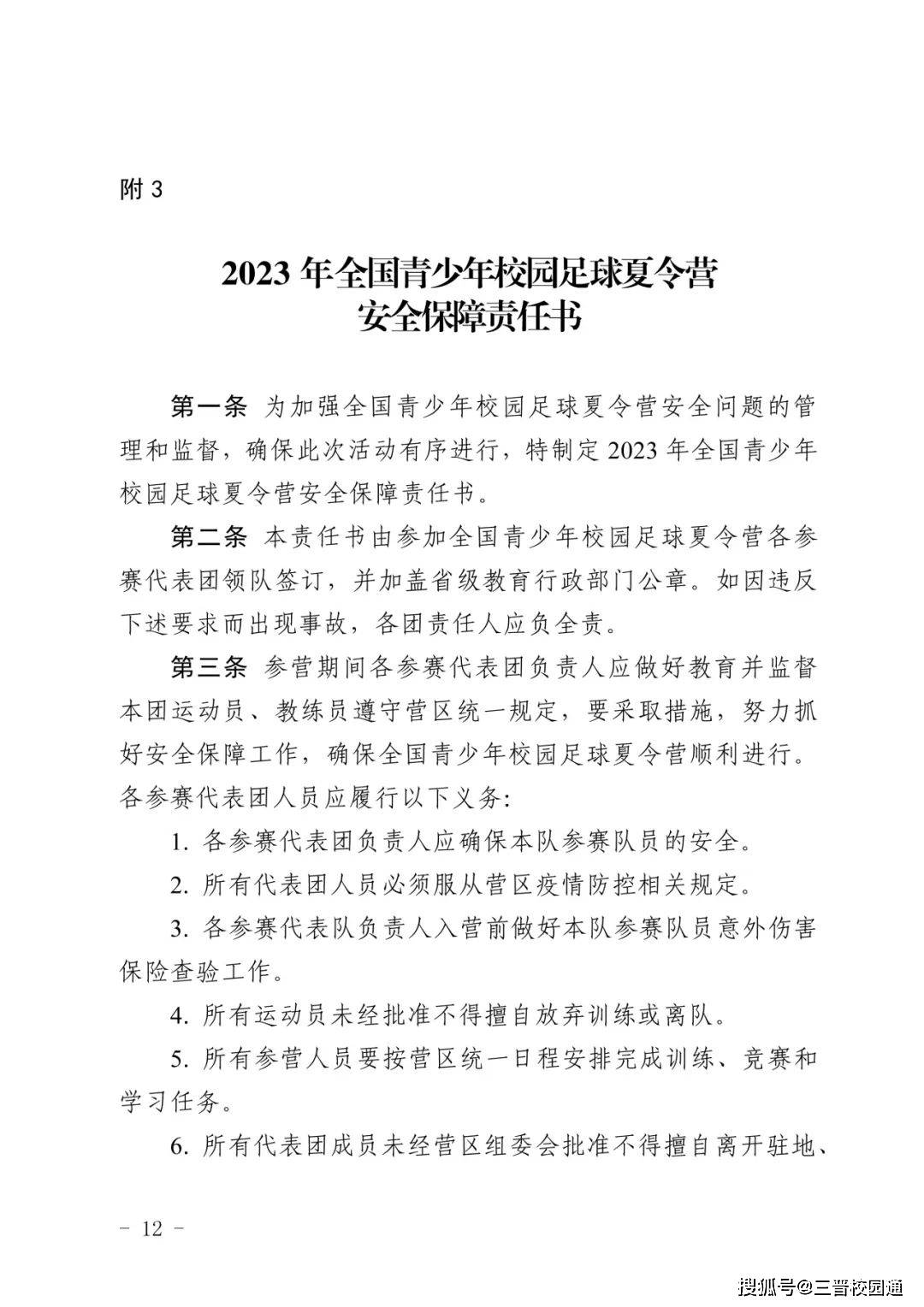 (三)参营运动员和随队人员要按时参加营区活动,严格遵守夏令营竞赛的各项管理规定,树立山西学生运动员的优秀形象,维护青少年校园足球活动的良好风气。
