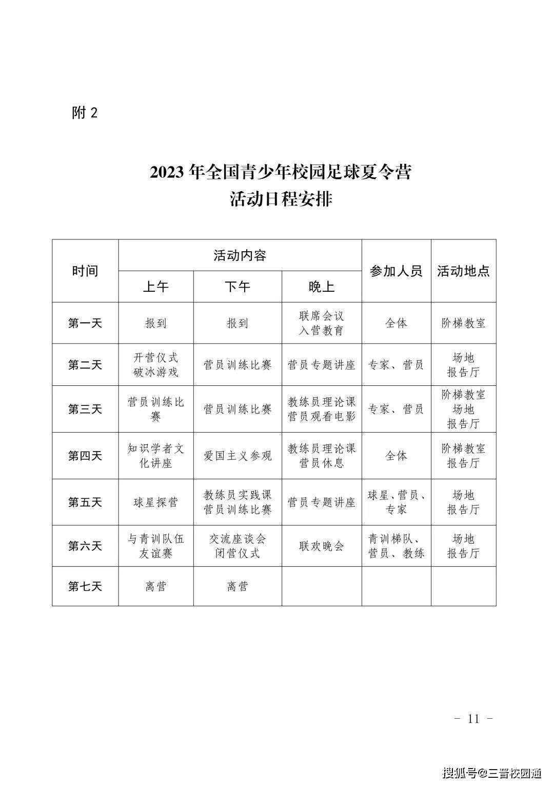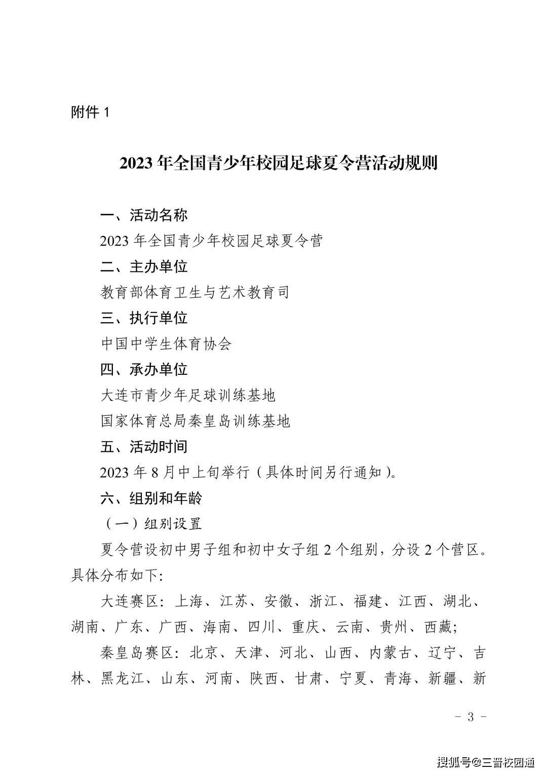 按照《教育部办公厅关于举办2023年全国青少年校园足球夏 令营活动的通知》(教体艺厅函〔 2023〕18号)要求,教育部将于 2023年8月13日-19日在国家体育总局秦皇岛训练基地(中国足 球学校)(地址:河北省秦皇岛市海港区文体路5号)举办全国青 少年校园足球夏令营。为了组织好我省的参营工作,现将有关事 项通知如下。