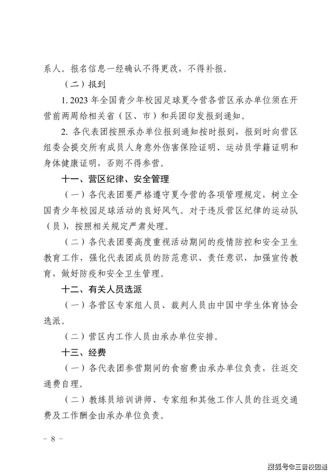 (四)各组别要在报到时向营区组委会提交所有成员人身意外伤害保险证明、第二代身份证原件、运动员学籍证明、身体健康证明和《2023年全国青少年校园足球夏令营安全保障责任书》,否则不得参营。
