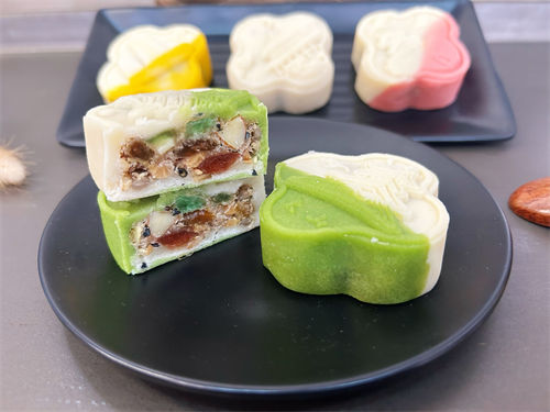 为了让月饼更有文化味,在保留传统制作工艺的基础上,今年,李璐开始采用晋祠大米米粉制作带有闻名遐迩的太原地标元素的“炉食人人马马”。功夫不负有心人,经过反复试制,最终李璐摸索出晋祠大米、白玉米和白芸豆的独家用料配比。同时,再把菠菜、南瓜、玫瑰、紫薯等榨成汁,调配成纯天然颜料活入面中,包入由巴旦木、腰果等干果配成的馅料,放入刻有太原地标元素的模具中,按压、脱模,一个个印有太山龙泉寺、晋祠圣母殿、太原古县城等造型的套色米月饼就成型了。