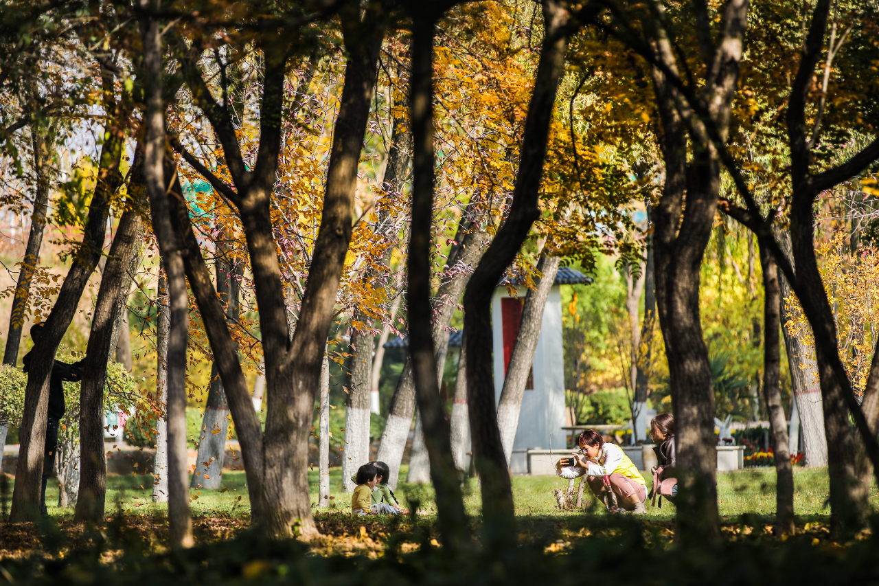 10月31日,南寨公园树影与黄叶交织,为市民呈现出一幅绚丽多彩的秋日画卷。