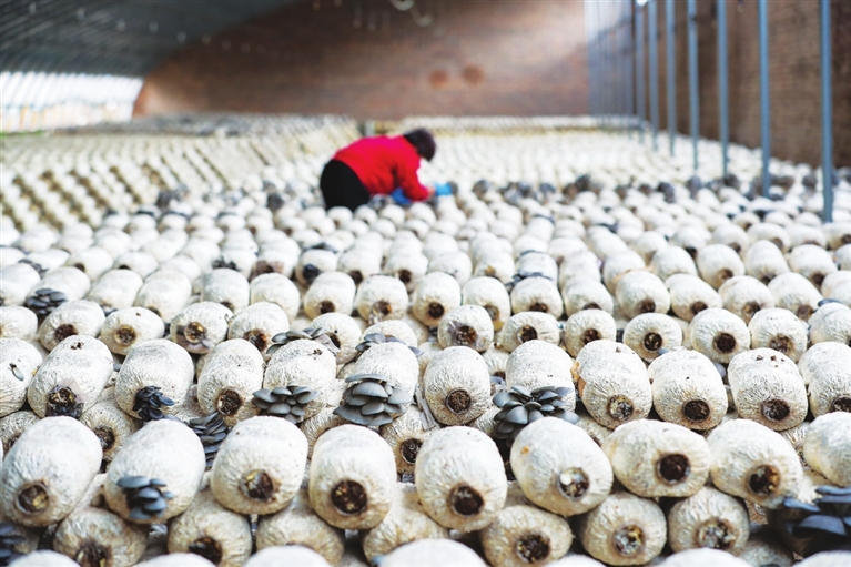 10月28日,杏花岭区山河村蘑菇大棚内,工人忙着采摘平菇。该村发展食用菌、蔬菜种植等生态产业,持续壮大村集体经济,带动村民增收致富。
